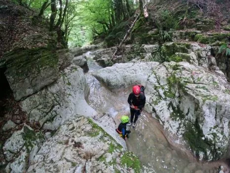 Laat u door uw kinderen meenemen op de waterwandeling van de Pont du Diable in de nant de Glapigny, een zachte en verfrissende avontuur ideaal voor gezinnen, gelegen in het prachtige Bauges massief, stroomopwaarts van de afdaling van de Pont du Diable canyon. In tegenstelling tot canyoning, vindt waterwandelen plaats in minder verticale omgevingen, zonder abseilen of klimmen, waardoor deze activiteit toegankelijk is voor kinderen vanaf 6 jaar en voor beginners.
